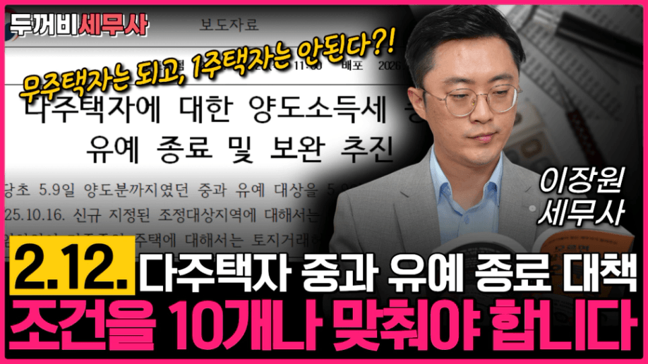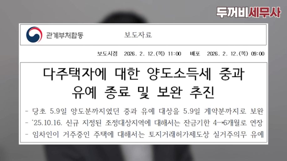 2026년 2월 12일, 다주택자 양도소득세 중과 유예 종료 및 보완 대책이 전격 발표되었습니다.