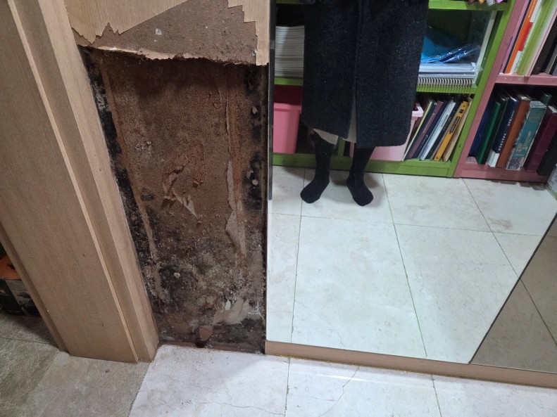 화장실 욕조쪽 누수로 인한 습기가 반대편 벽쪽으로 타고 가서