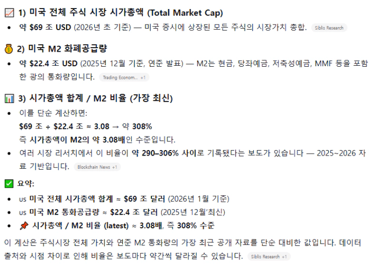 미국 상장사 시가총액의 합계 / 통화량 : 25년 7월=>  2.86, 3에 근접하면 주가 과열되니 조심 (P.297)