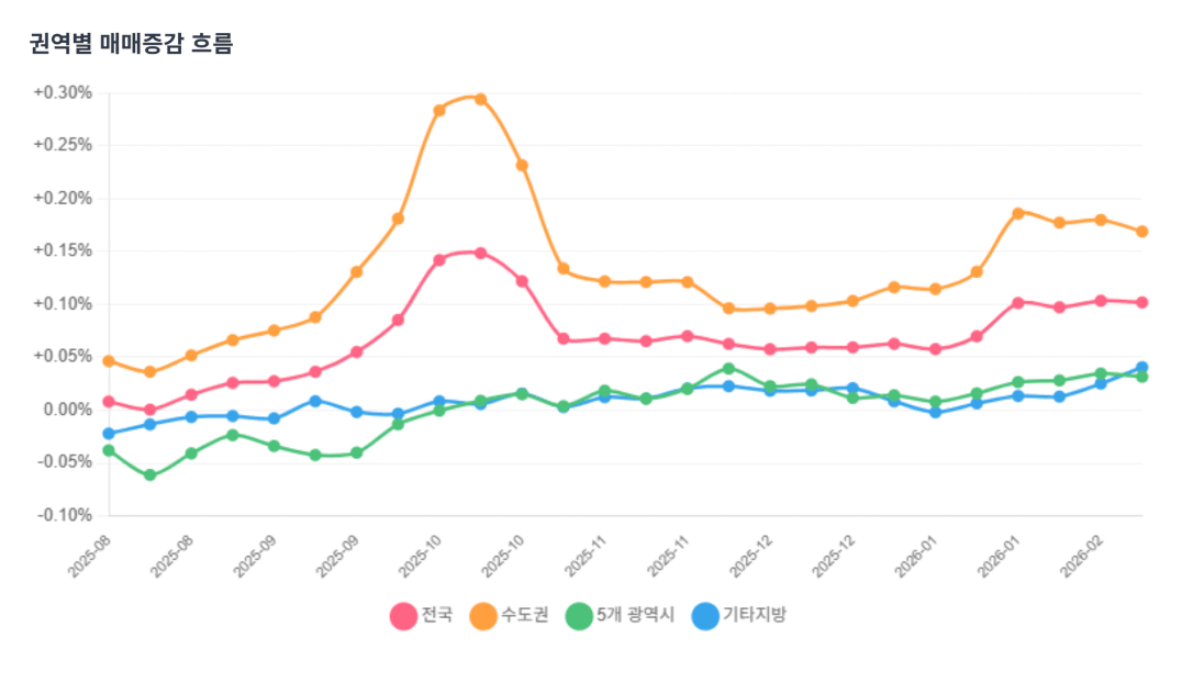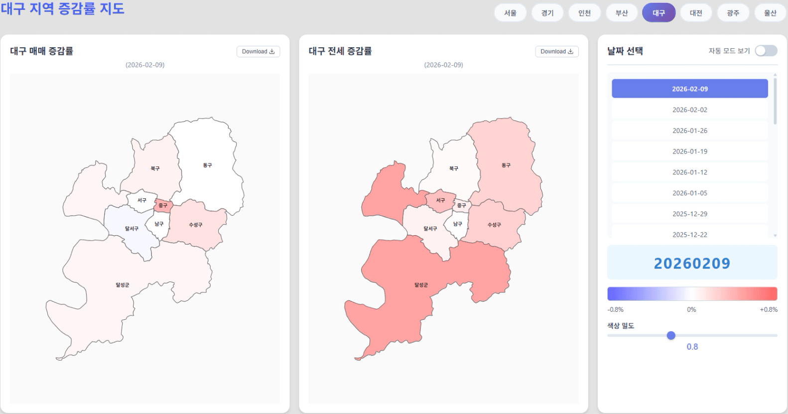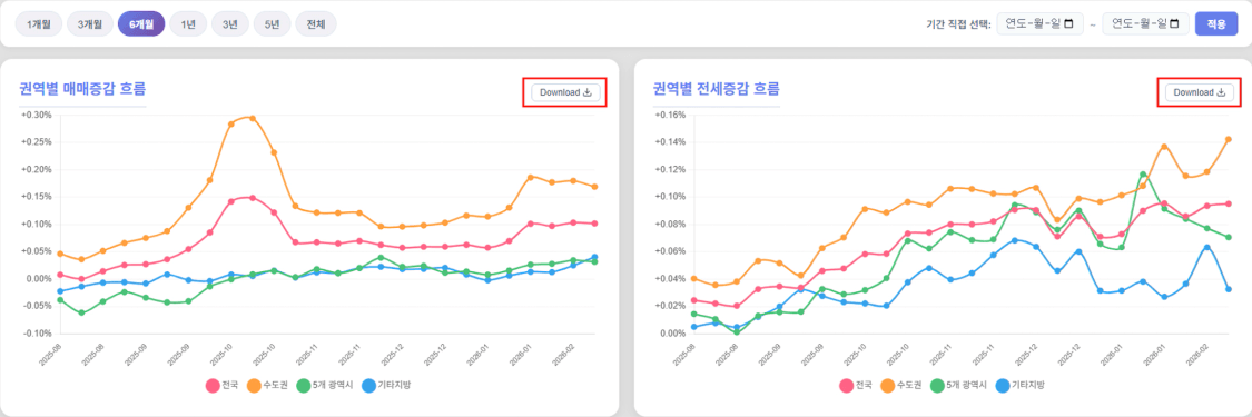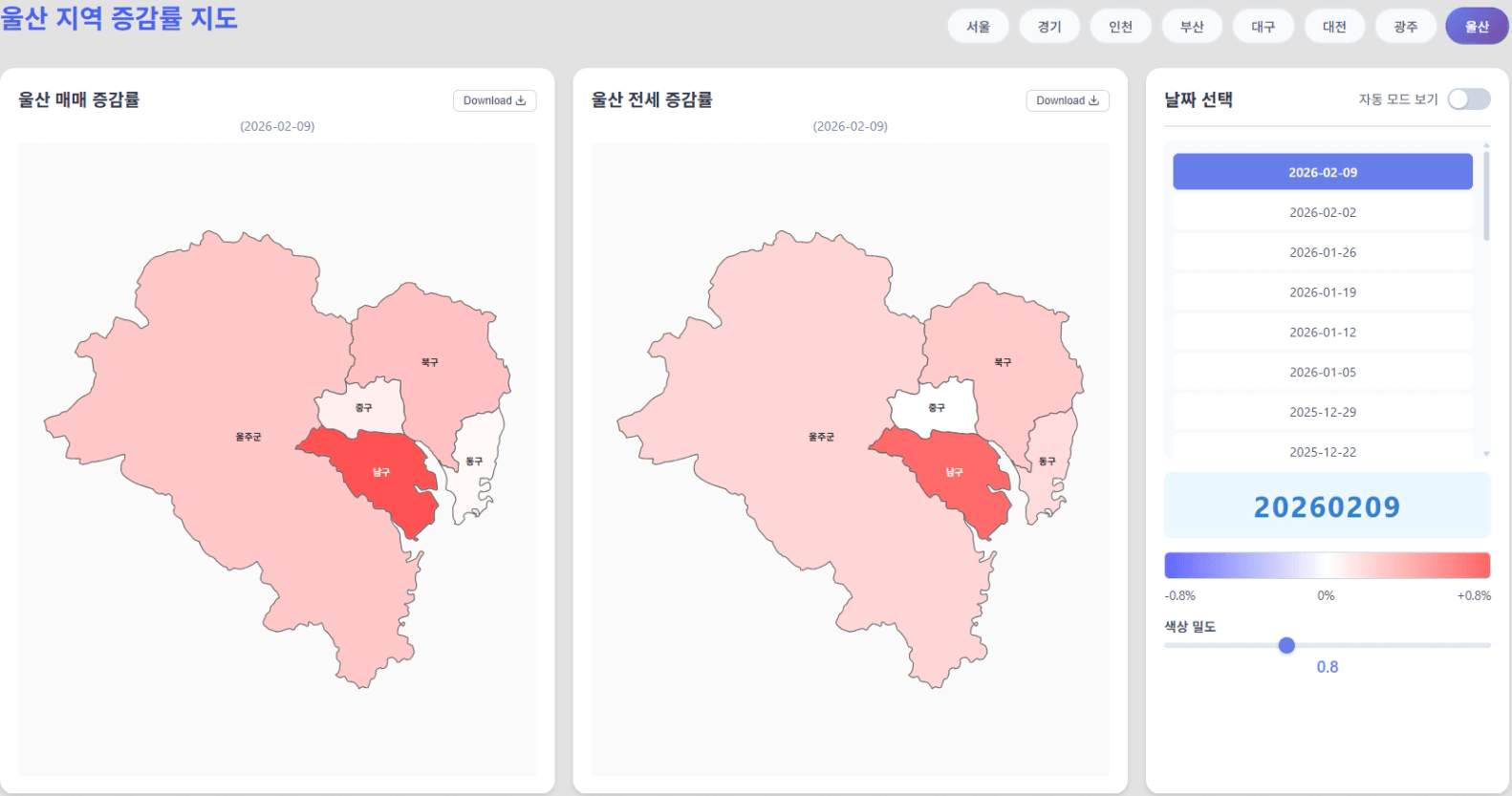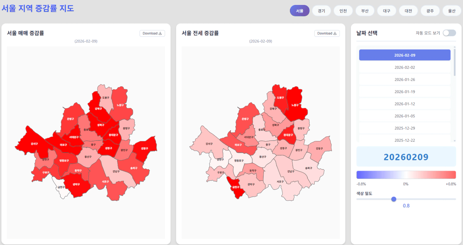 - 주요 지역(서울, 경기, 인천, 부산, 대구, 대전, 광주, 울산)별 매매증감/전세증감 데이터를 차트로 구현했습니다.