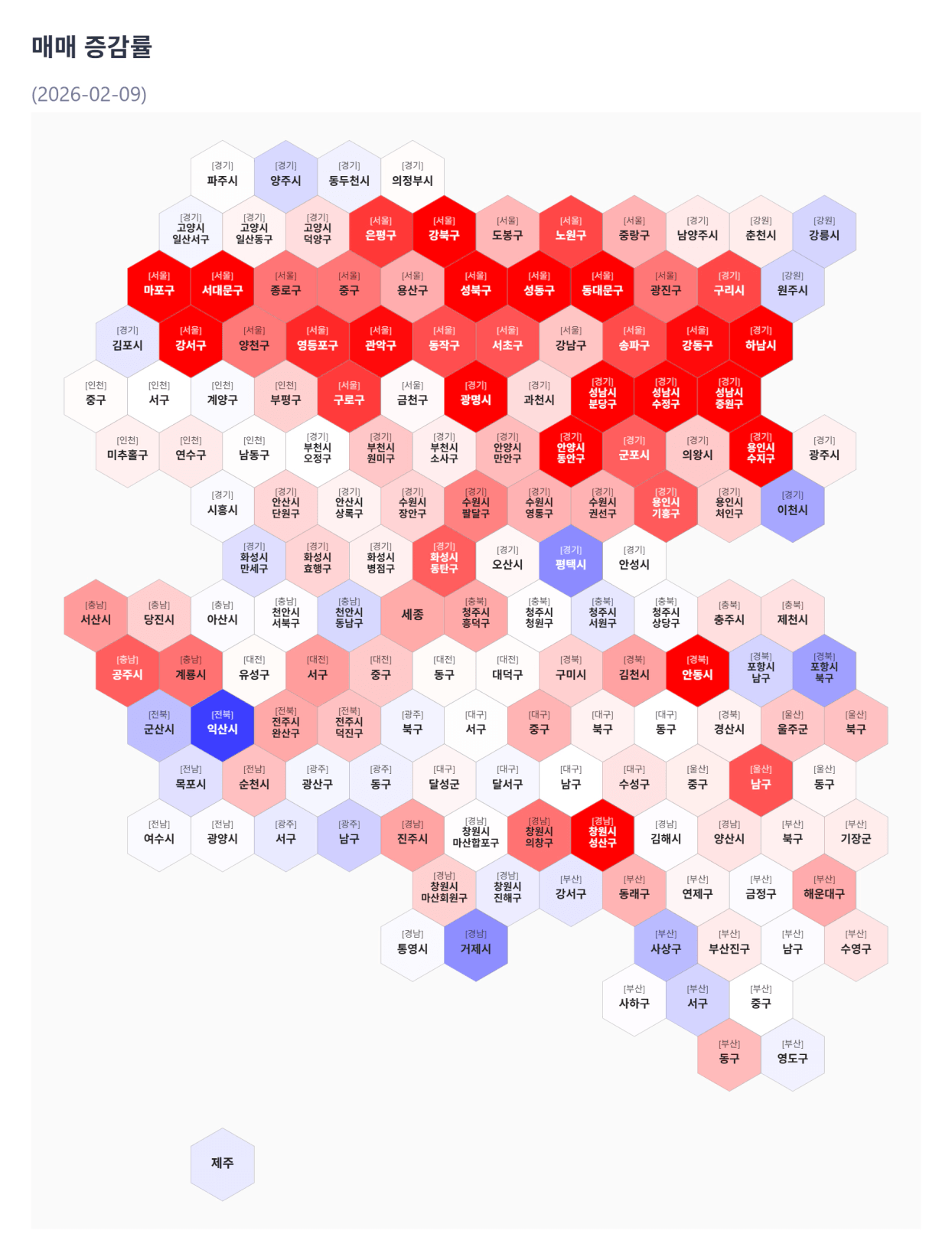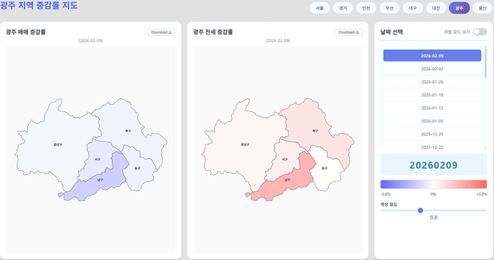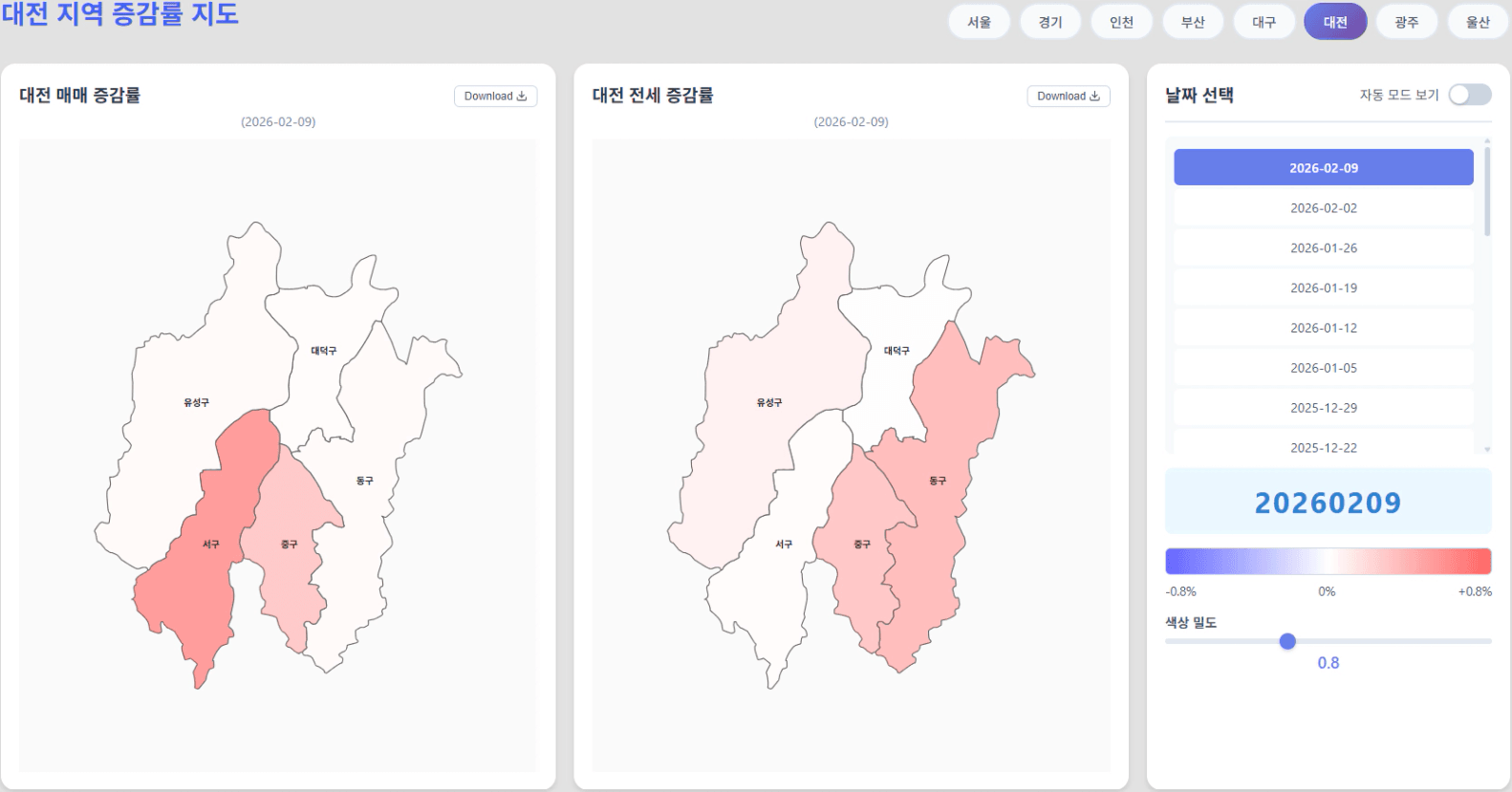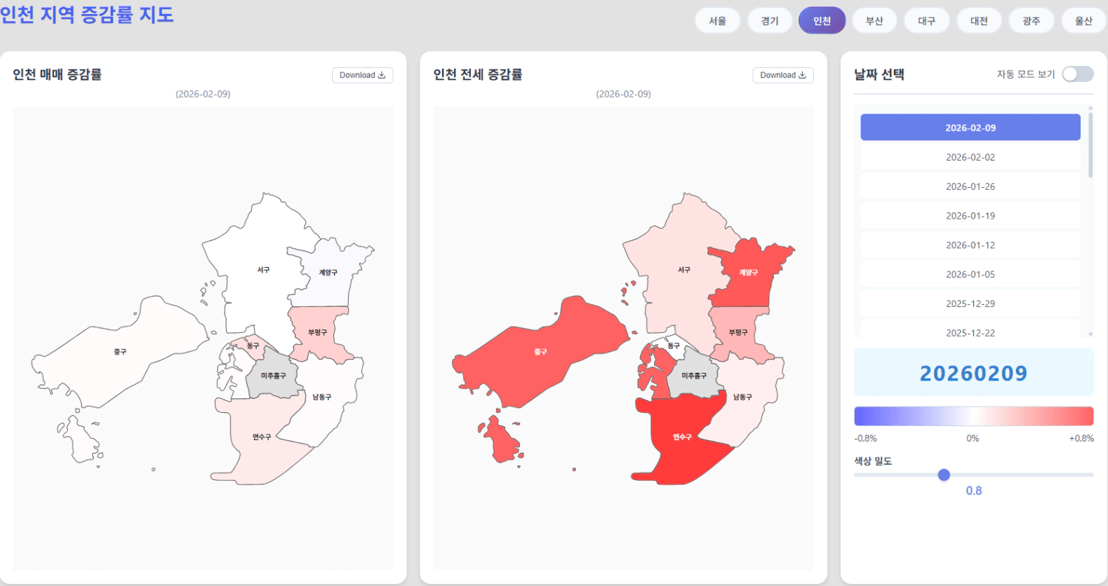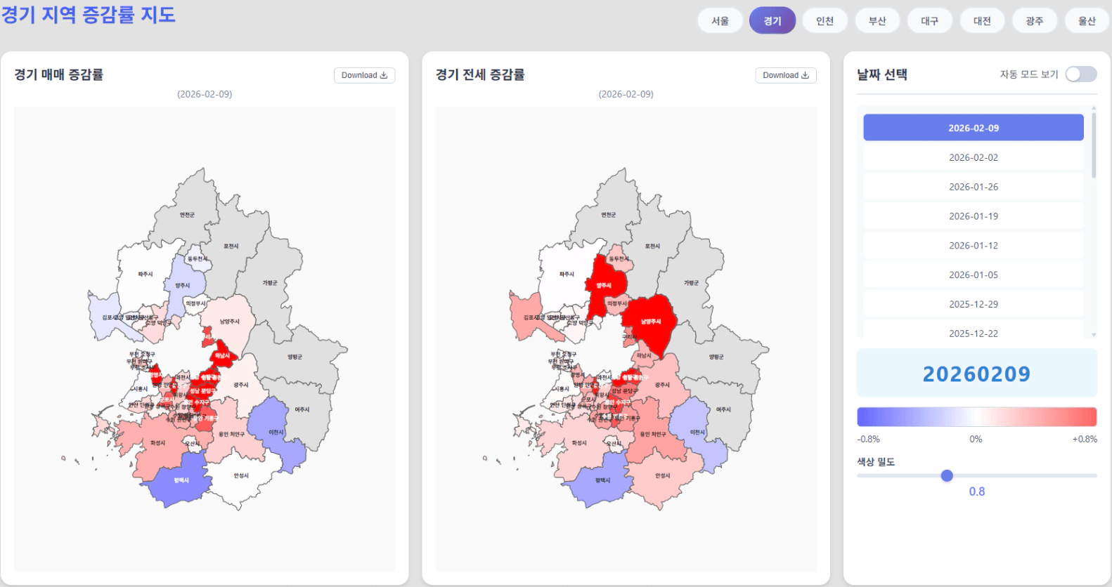매매증감, 전세증감 데이터를 주요 지역(수도권, 광역시)의 각 지역별로 지도로 보실 수 있게 구현했습니다.