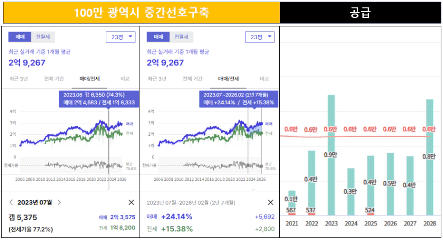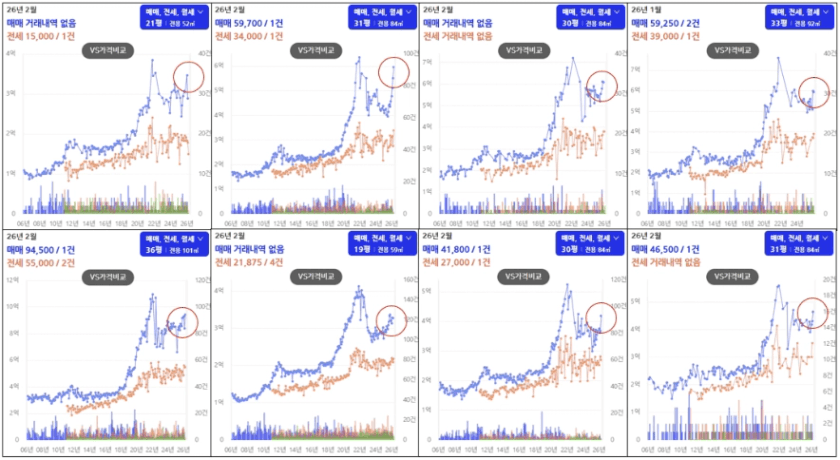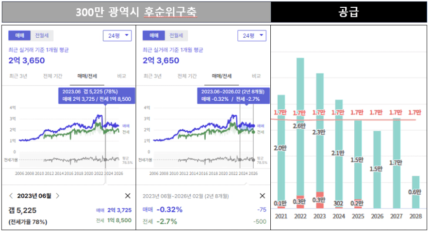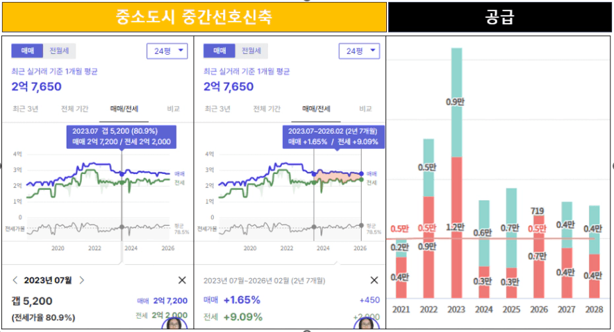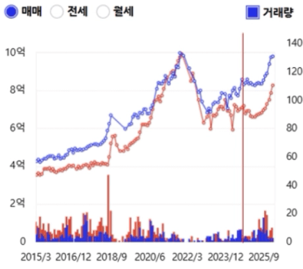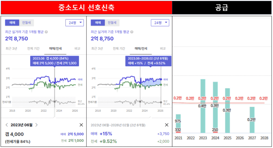 후보단지2는 이주 수요로 인해서 일시적으로 전세가 마르면서 매매가가 반등했지만, 25년 공급장에서 버티지 못하고 원래 가격 수준으로 돌아왔습니다.