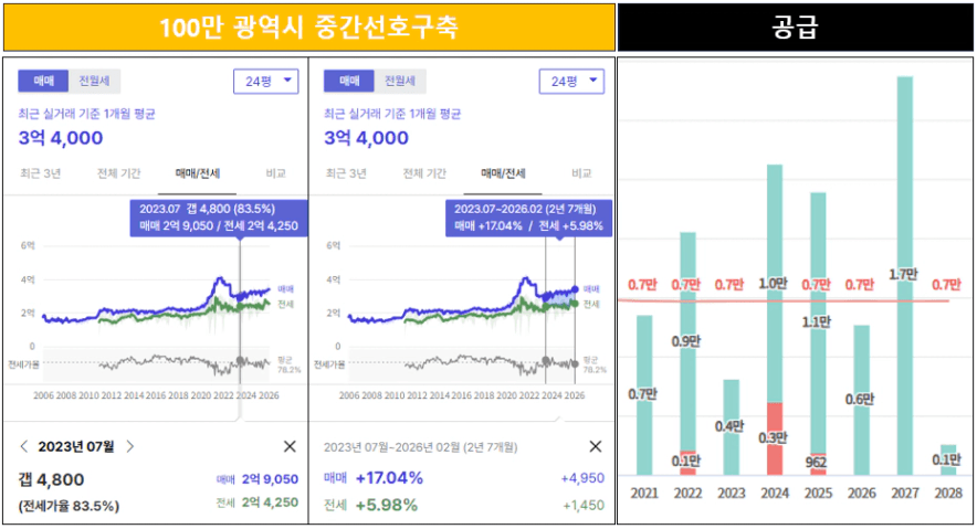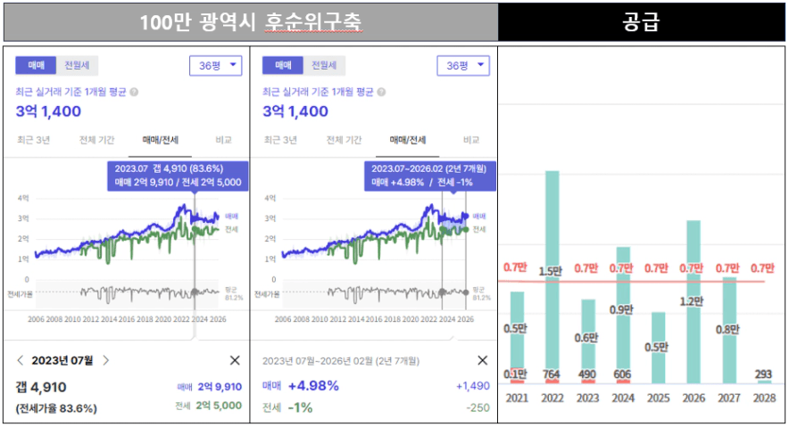 가격이 절대적으로 쌌던 시기였기에 사람들이 좋아하는 단지부터 투자를 했어야 했고, 공급 리스크를 대비하기 위해서 3년 전세를 세팅하는 것이 유리했습니다.
