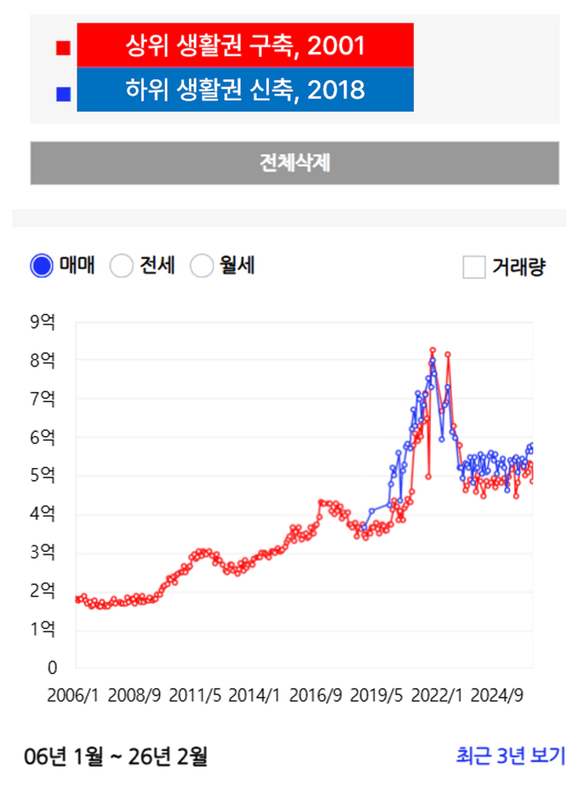 저라면 빨간색 그래프의 구축 단지에 너무 살고 싶거든요!ㅎㅎㅎ