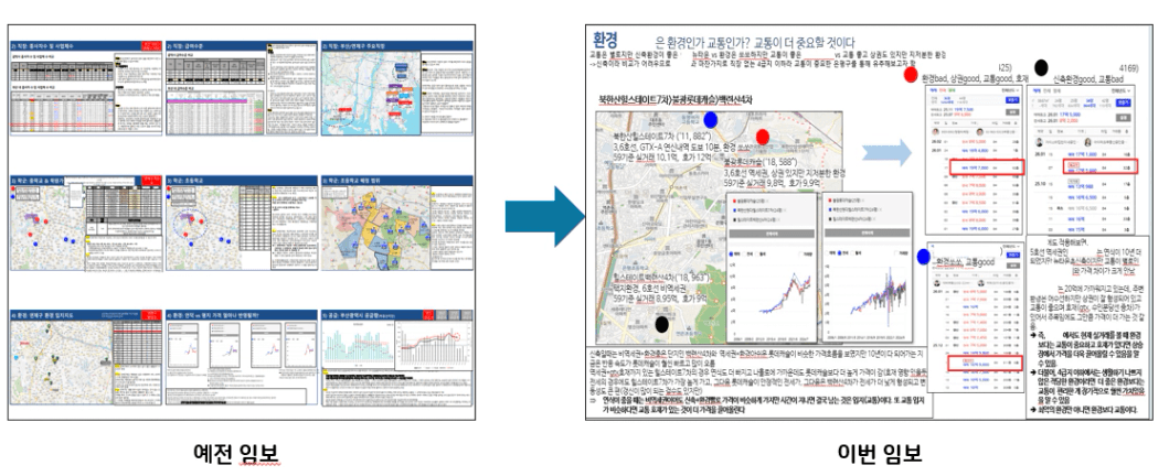 이번에 분위기 임장을 하면서 동료분들이 교통이 별로이지만 신축 환경 개선이 있었던 지역과 교통이 너무 좋지만 연식이 아쉬워지는 생활권에 대한 고민을 많이 하시는 걸 보며 저도 그 부분이 이 지역을 이해하는데 중요한 키워드가 되겠구나~라는 생각을 할 수 있었습니다. (환경 개선이 있었어도 교통이 우선인가?→환경 핵심질문)