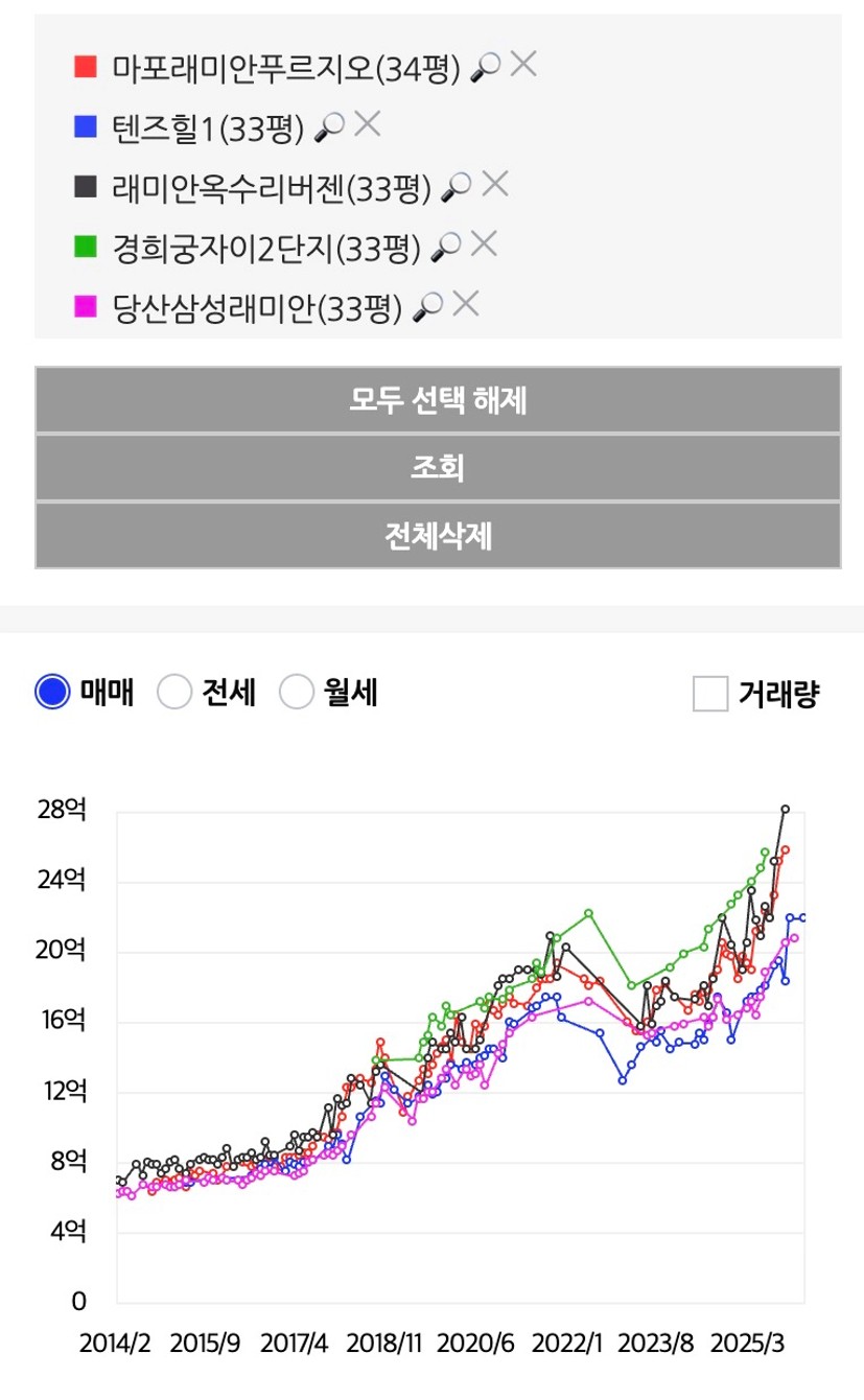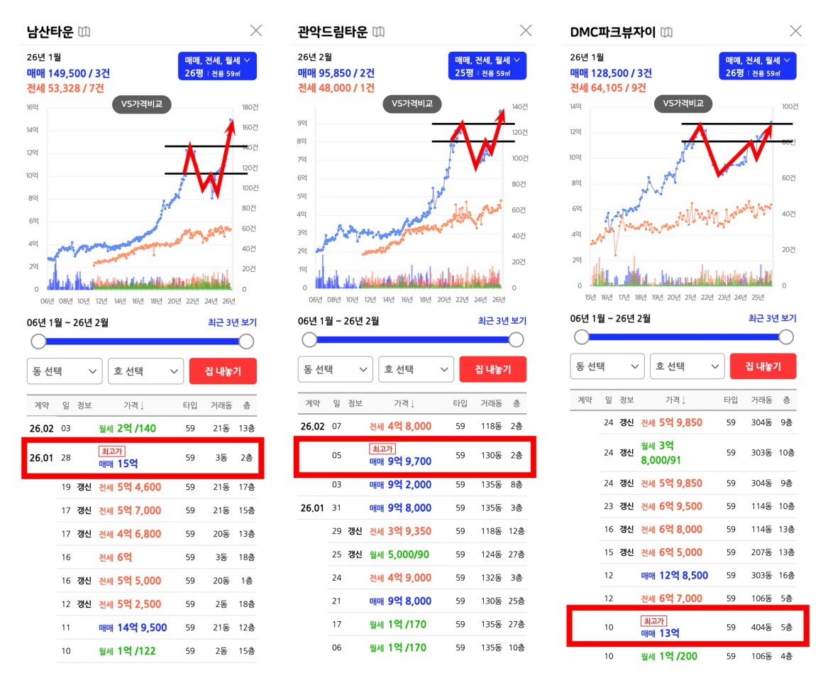 → 확실히 작년에 이야기했던 엘리트는 2025년 벌써 25평 기준 W파고를 이미 달성했고 현재 규제 이후 더 빠른 상승폭으로 날아가는 현상을 보였다. 현 남상타운, 관드, DMC는 최근 규제를 지나 평형별로 다르지만 26년 1~2월에 되고서야 이전 전고를 넘어서거나 이제 막 전고점을 터치한 모습을 보인다.