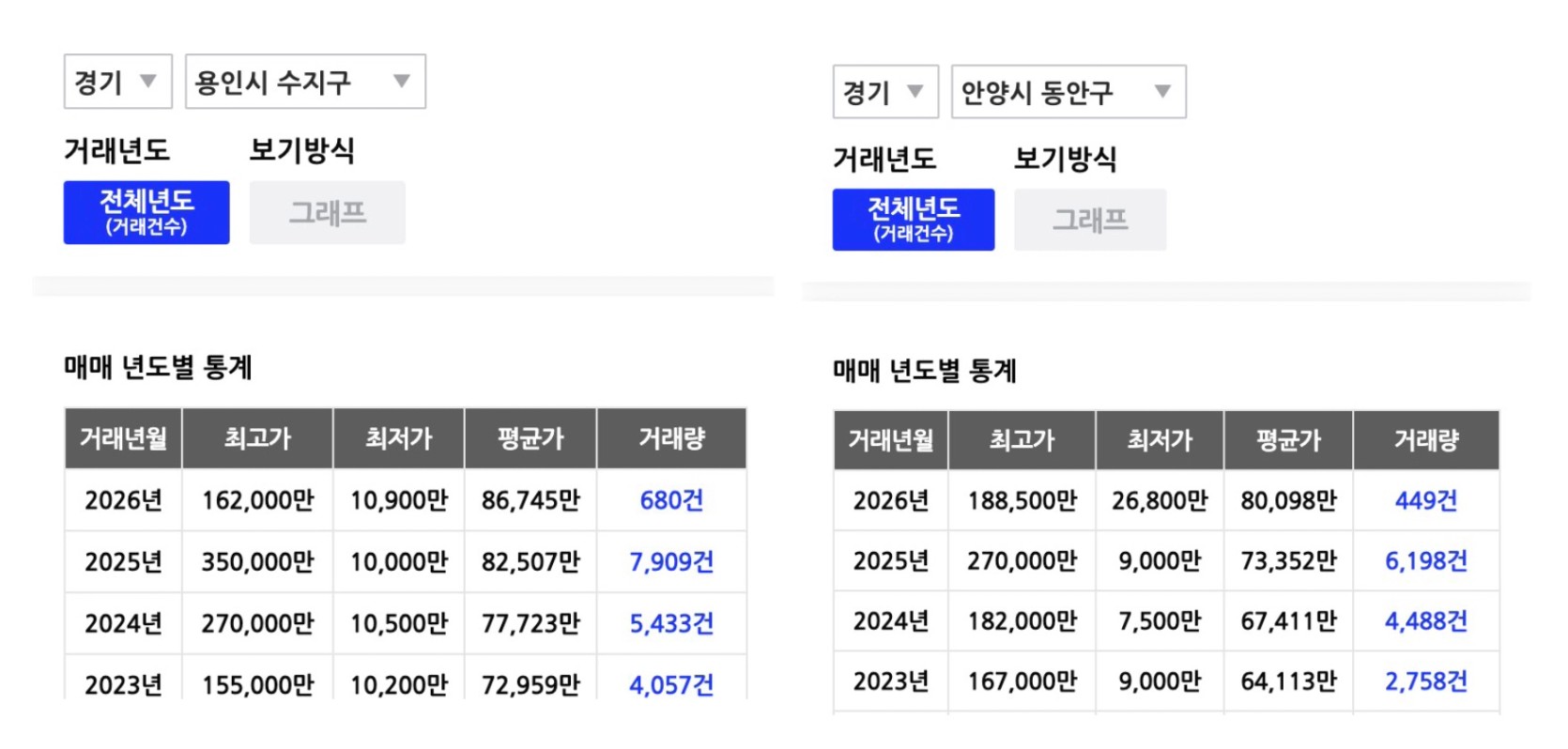 → 시장이 바닥이었던 2023년 대비 2025년 거래량 증가율은 비교하면 23년 평촌 : 2,758건 → 25년(회복) 6,198건으로 약 124.7% 증가 / 23년 수지 : 4,057건 → 25년(회복) 7,909건으로 약 95% 증가. 책에서는 최저점 월과 최고점 월을 직접 비교햇을 가능성이 높고 23년 수준과 거래가 폭발했던 25년 특정 월과 비교하면 책에서 나온 것처럼 300% 이상의 결과가 도출되었을 것으로 예상된다. 연간 데이터로 보더라도 평촌 증가율이 > 수지보다는 거래가 많이 되었다는 점은 일맥상통하다. 그렇다면 왜 평촌의 거래량이 더 늘었을까?