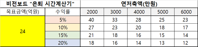 목표 금액 24억 (현재 2023년 나이 43세, 연저축액 5000만원)