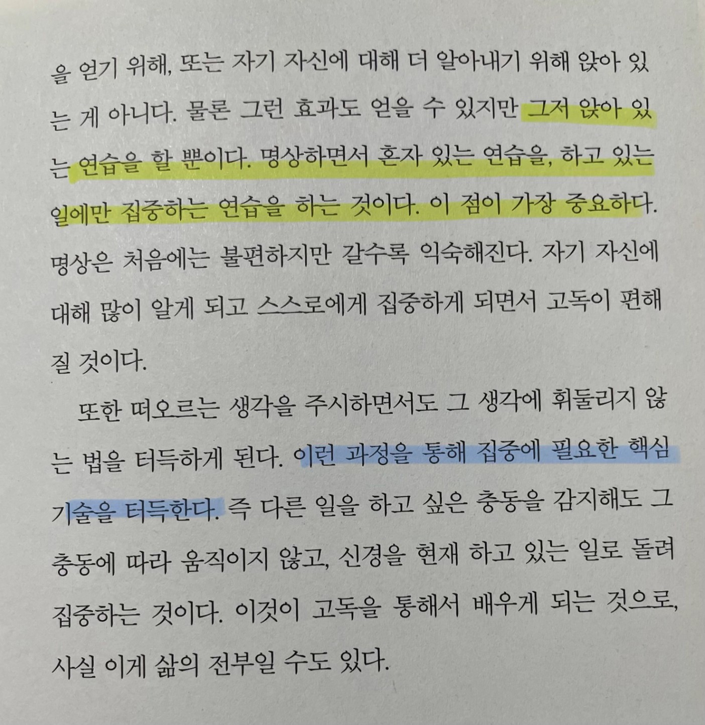 p.57 그저 앉아 있는 연습을 할 뿐이다. 명상하면서 혼자 있는 연습을, 하고 있는 일에만 집중하는 연습을 하는 것이다. 이 점이 가장 중요하다.