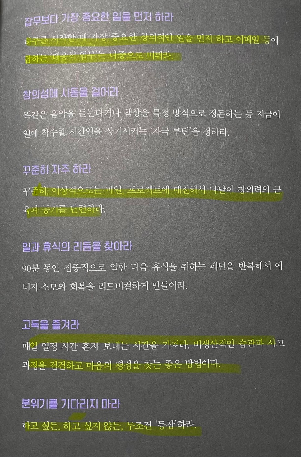 p.59 고독을 즐겨라. 매일 일정 시간 혼자 보내는 시간을 가져라. 비생산적인 습관과 사고 과정을 점검하고 마음의 평정을 찾는 좋은 방법이다. 분위기를 기다리지 마라. 하고 싶든, 하고 싶지 않든, 무조건 '등장'하라.