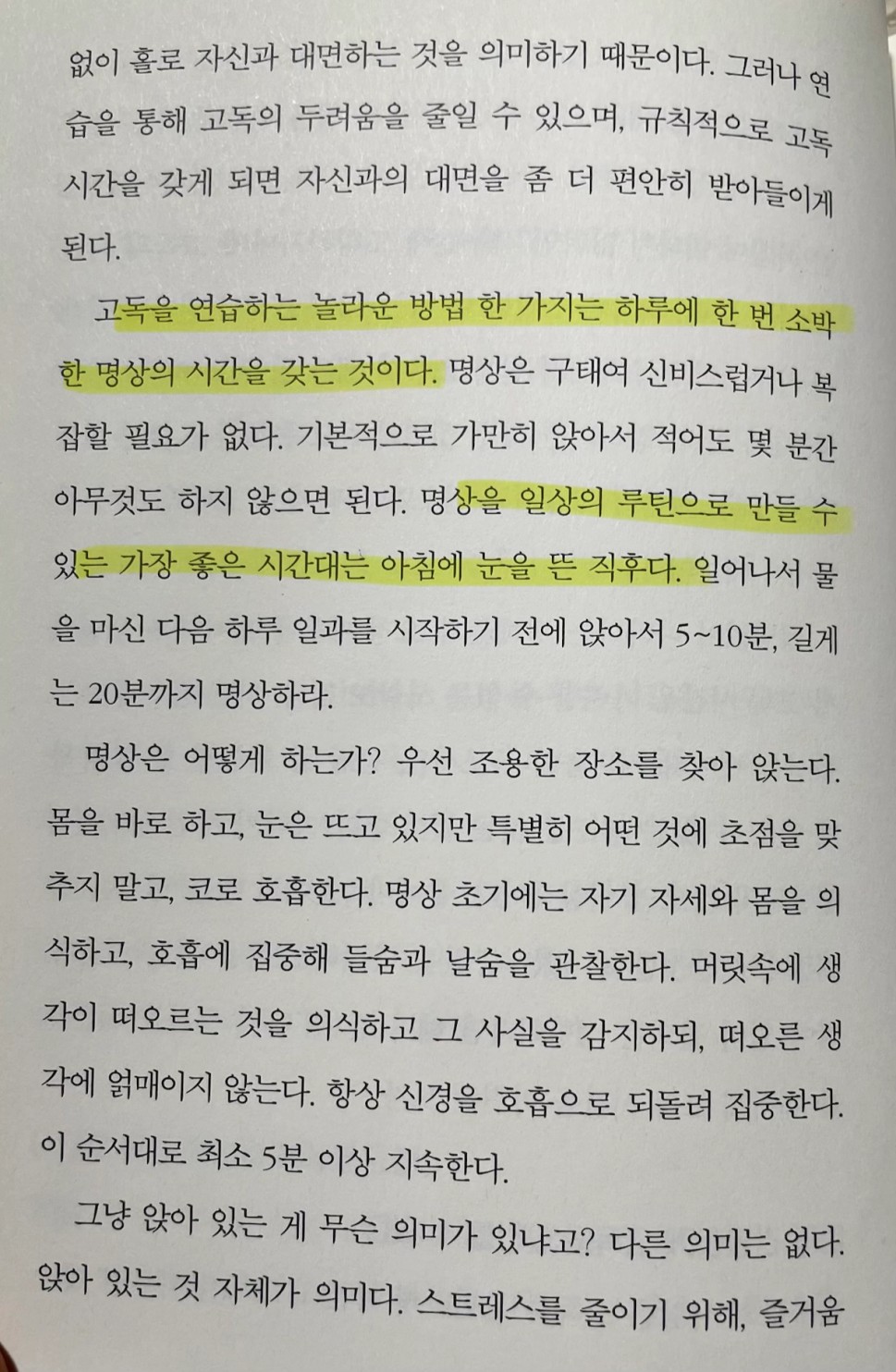 p.56 고독을 연습하는 놀라운 방법 한 가지는 하루에 한 번 소박한 명상의 시간을 갖는 것이다.