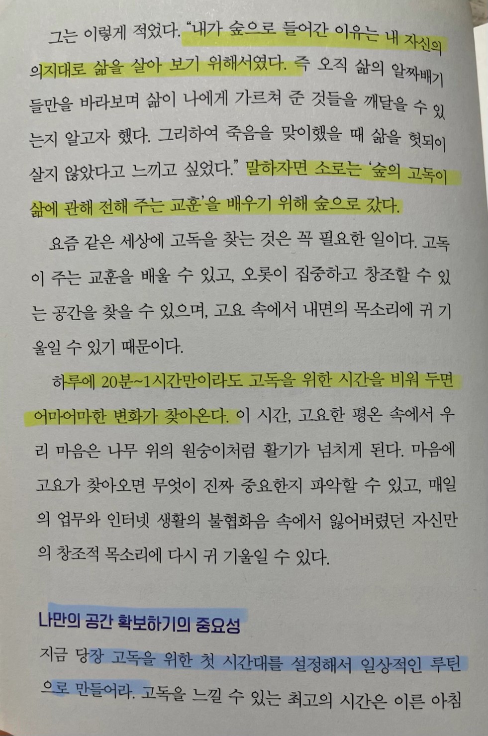 p.54 "내가 숲으로 들어간 이유는 내 자신의 의지대로 삶을 살아 보기 위해서였다." .. 말하자면 소로는 '숲의 고독이 삶에 관해 전해 주는 교훈'을 배우기 위해 숲으로 갔다. .. 하루에 20분~1시간만이라도 고독을 위한 시간을 비워 두면 어마어마한 변화가 찾아온다.