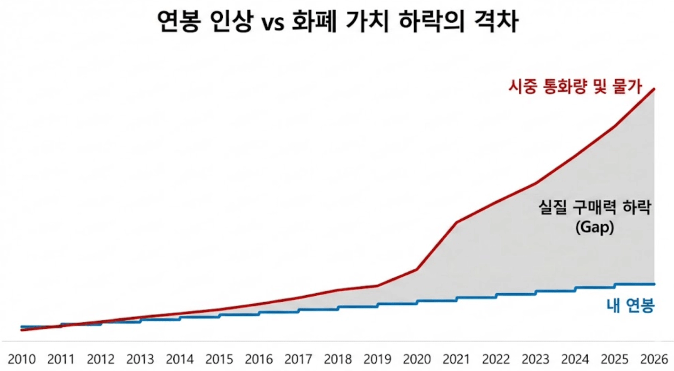 더 무서운 것은 '화폐 가치의 하락'입니다. 시중에 풀리는 돈의 양(통화량)은 매년 평균 7%에서 10%가량 늘어납니다. 당신의 연봉 인상률이 이 속도를 따라잡지 못한다면, 당신은 열심히 일할수록 상대적으로 가난해지고 있는 셈입니다. 실제로 10억 원을 모아 예금에만 넣어둔 사람과, 그 돈을 실물 자산으로 바꾼 사람의 10년 뒤 자산 격차는 2배 이상 벌어진다는 시뮬레이션 결과도 있습니다. 결국 노동 소득에만 전적으로 의존하는 구조는 시간이 갈수록 당신을 노후 빈곤으로 몰아넣는 가장 확실한 길입니다.