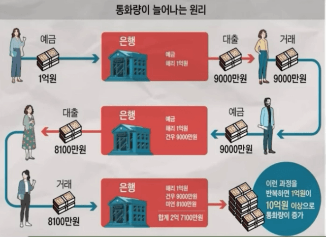 → 1억만 찍어내도 은행에서 대출을 통해 돈은 미친듯이 불어난다. 사람들은 이제 대출을 무서워 하지 않고 적극적으로 활용하고 있다. 결국 화폐 가치는 시간이 갈수록 떨어질 수 밖에 없다. 사람들은 대출을 더 해서 집을 살걸..이라는 생각을 한다.
