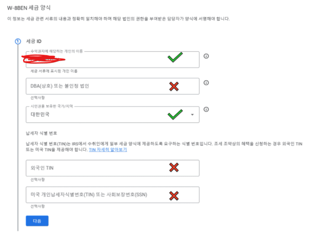 타인의 명의로 된 계정인데, [세금 ID] 입력 페이지에서