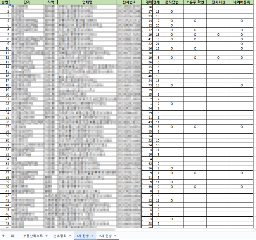 전세세팅 나눔글들을보며 저도 아래와 같은 리스트를 만들어서 문자를 돌리고 네이버등록 여부도 확인했습니다.