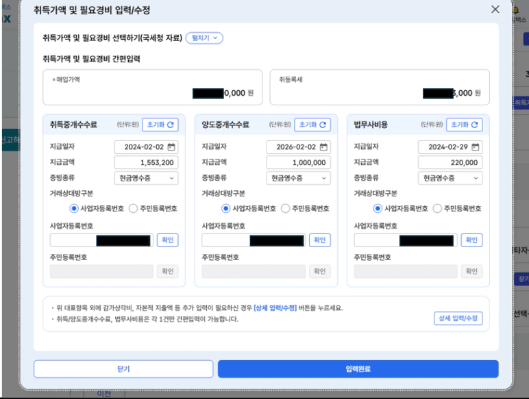매입가액을 작성하면, 취등록세 뜨고, 취득중개수수료, 양도중개수수료, 법무사비용은 지급일자와, 지급금액 그리고 사업자 등록번호를 띄우면 전자적으로 착착 진행이 되었습니다.