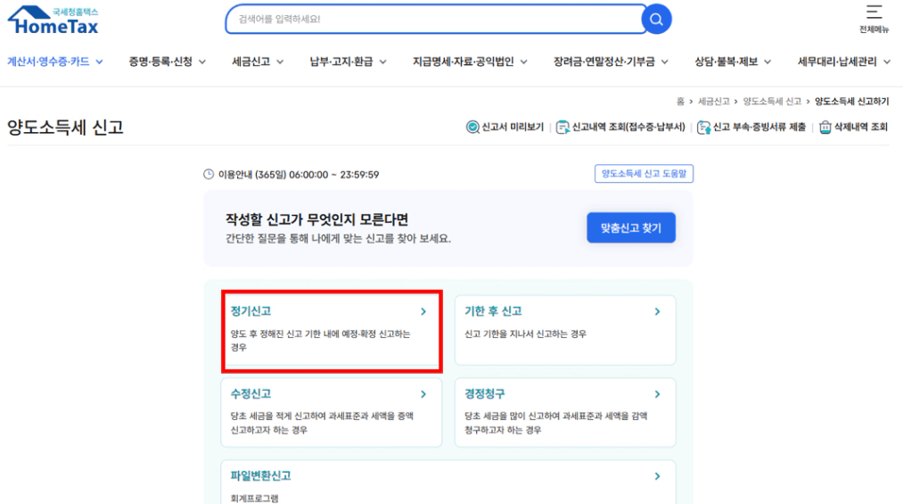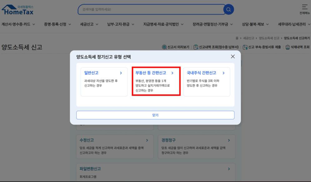 양도소득세 신고 > 정기신고 > 누르면 팝업이 뜹니다.