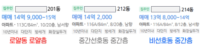 예시) 로얄동 중층 15억/ 중간동 중층 14.2억 / 맨끝동 중층 13.8억