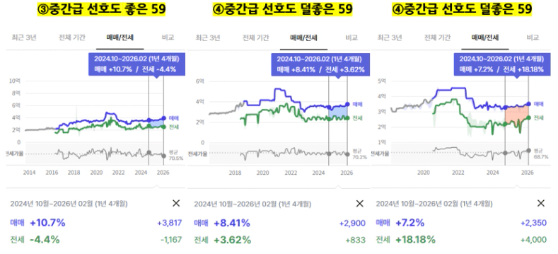 그래서 A광역시에서 선호도가 좋은 상급지 구축84, 중간급지 84, 중간급지 59까지