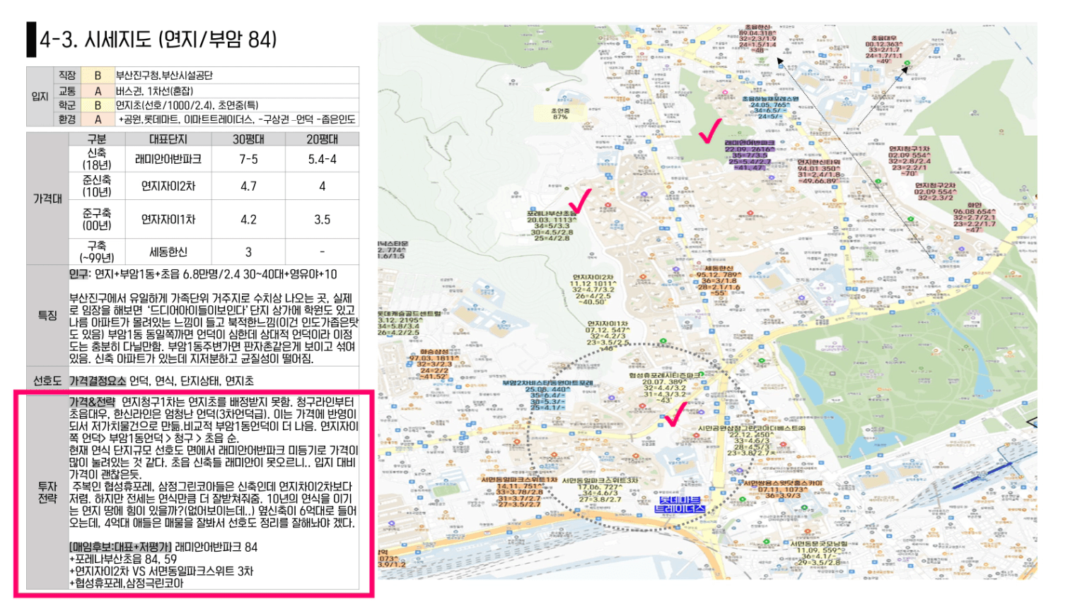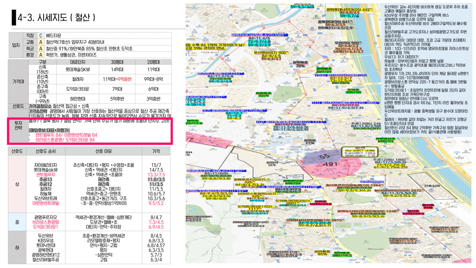 1. 저평가 단지 (투자 후보) 매임의 시작과 끝은 “가치 대비 싼가?”입니다. 시세지도를 그리면서 단지임장후 가치와 가격을 올려보며 가치보다 싼단지를 후보로 남깁니다.