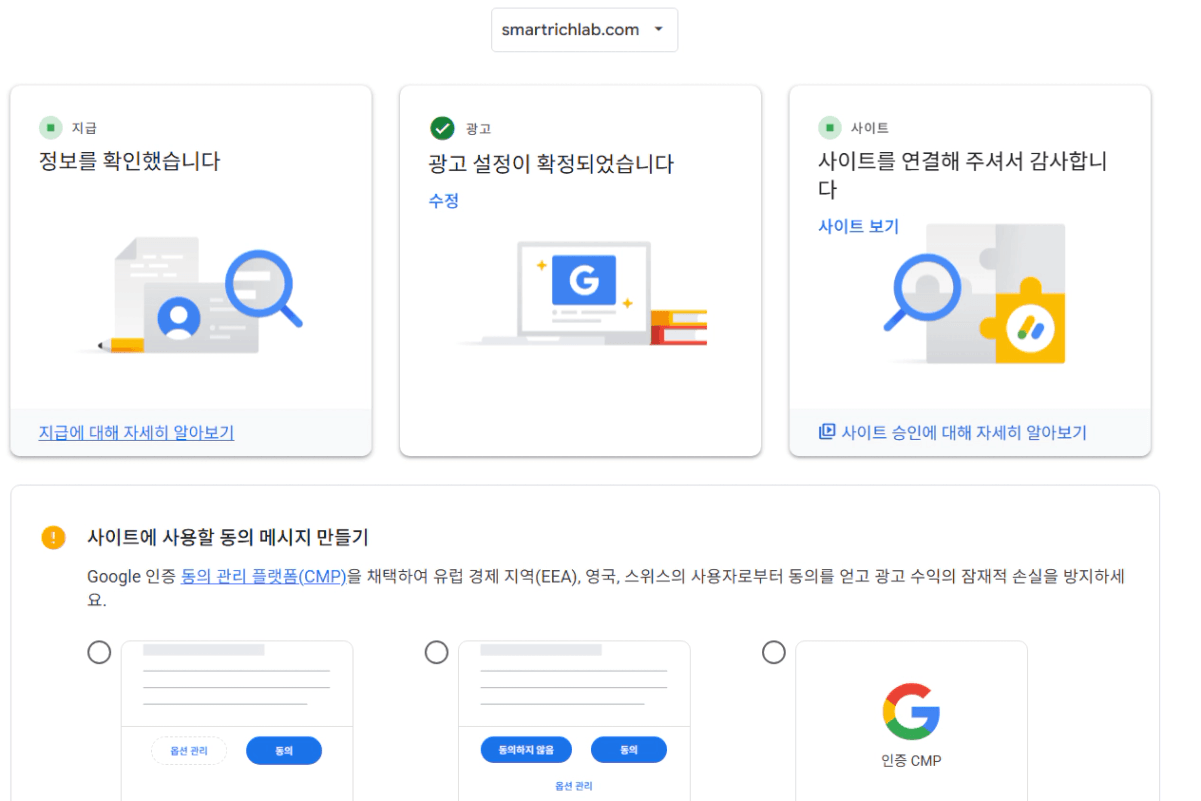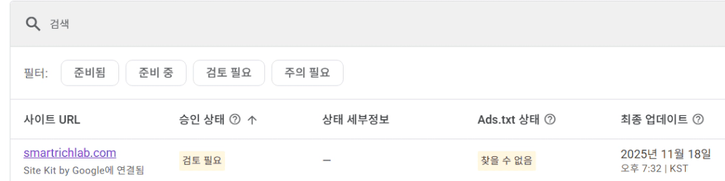 애드센스 승인을 재신청했는데 검토필요가 떠있어서 홈화면에 들어가보니 아래 2번 화면처럼 뜨거든요.