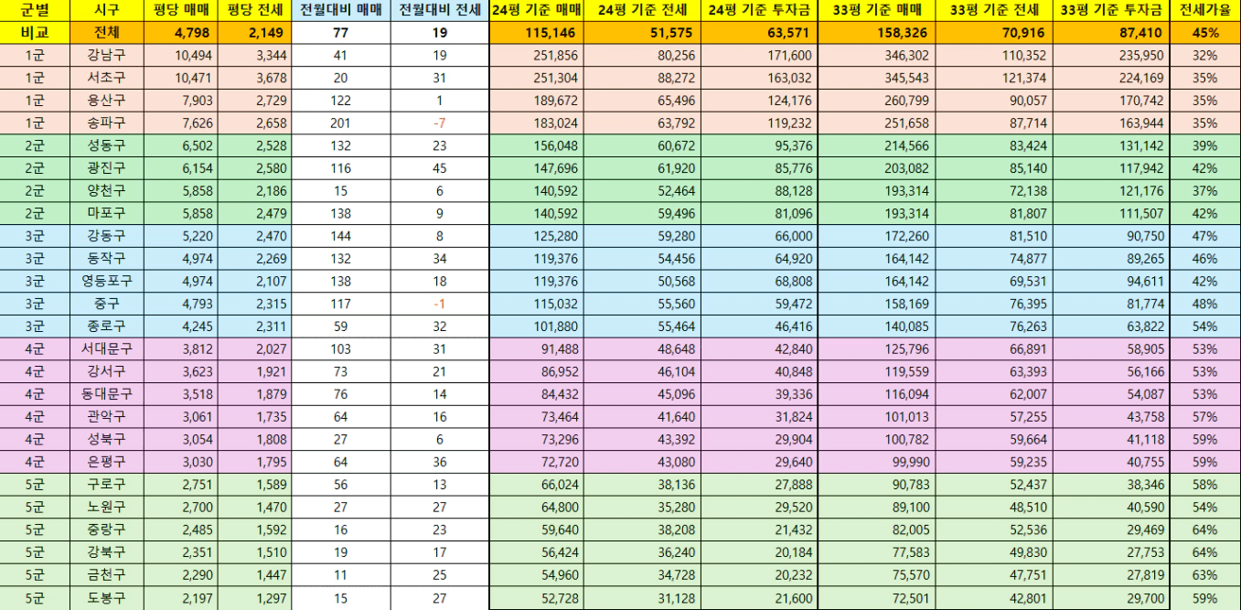 서울,수도권,광역시 매매/전세 평단가, 투자금 및 전세가율을 정리하였으니,
