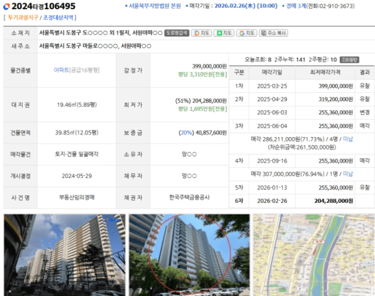 도봉동 서원아파트 114동 11층 물건이 감정가 3억 9,900만 원에서 두 차례 유찰되고, 재매각으로 진행되어 최저가 2억 428만 원까지 떨어졌더라고요.