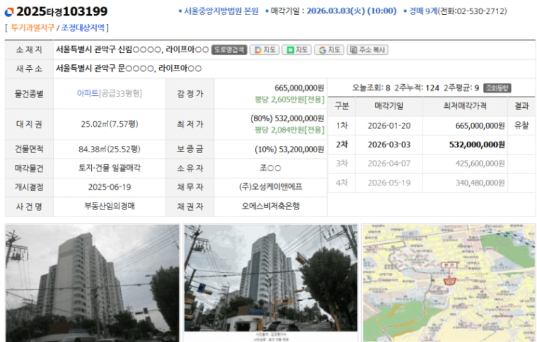✔ 감정가 / 최저가 (유찰 여부 포함): 665,000,000원 / 532,000,000원 (1회 유찰)