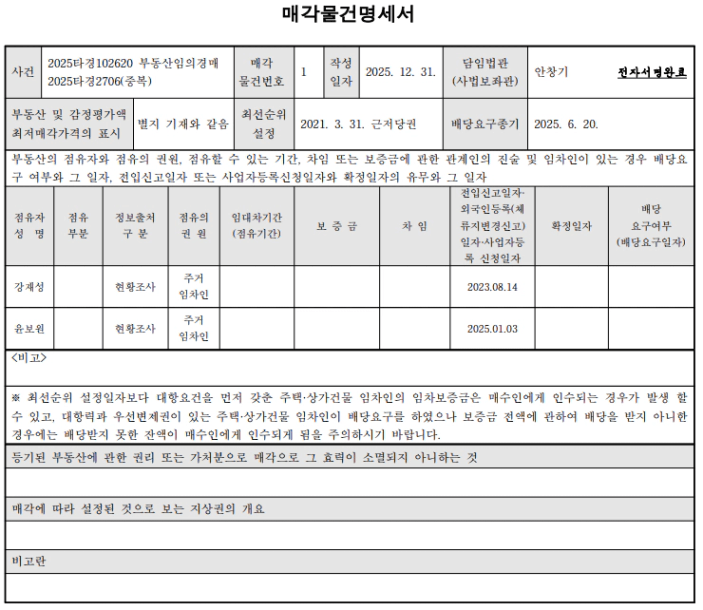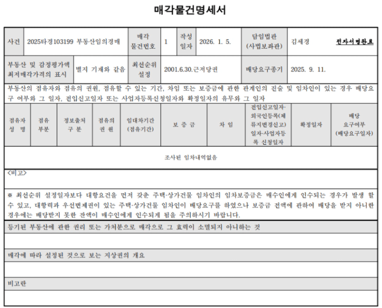매각 물건 명세서상 말소기준권리는 2021년 3월 31일 설정된 국민은행의 근저당권입니다.