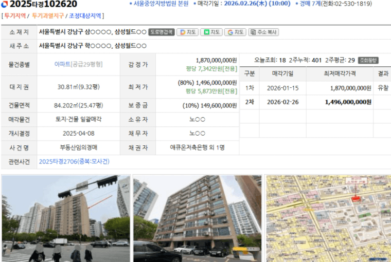 1회 유찰로 가격적인 메리트는 확보하였으나, 강남권 대형 평형인 만큼 경쟁률에 따른 최종 낙찰가는 신중하게 예측해야 할 시점입니다.