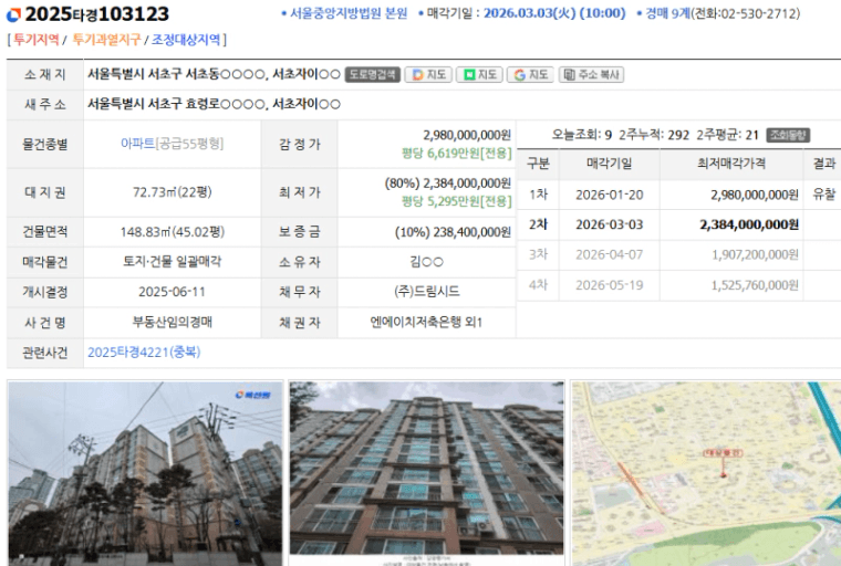 ✔ 감정가 / 최저가 (유찰 여부 포함): 2,980,000,000원 / 2,384,000,000원 (1회 유찰)
