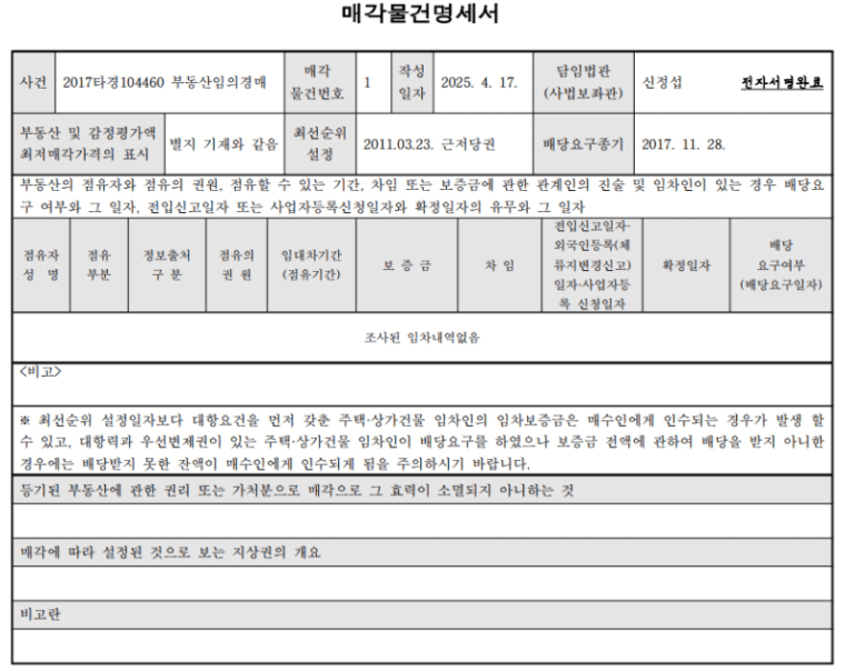 매각 물건 명세서상 말소기준권리는 2011년 3월 23일 설정된 근저당권입니다.