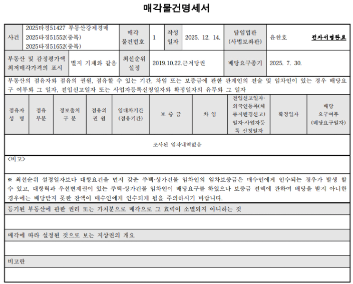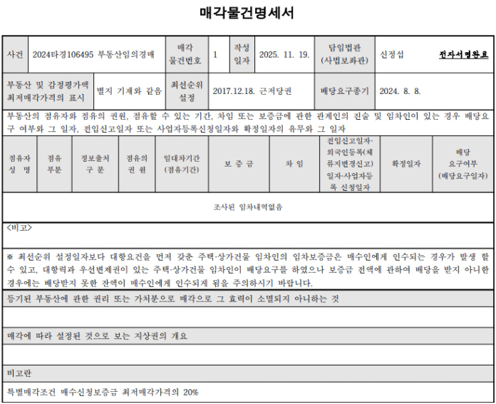 이 물건은 재매각 건이므로 입찰보증금이 최저가의 20%인 점을 반드시 기억해야 합니다.