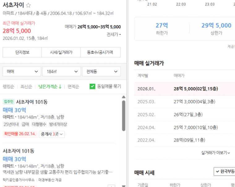 동일 평형의 최근 실거래가를 살펴보면 2026년 1월에 28억 5,000만 원에 거래된 건이 있습니다.