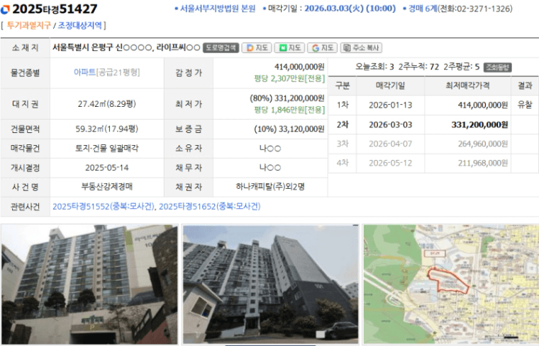 ✔ 감정가 / 최저가 (유찰 여부 포함): 414,000,000원 / 331,200,000원 (1회 유찰)