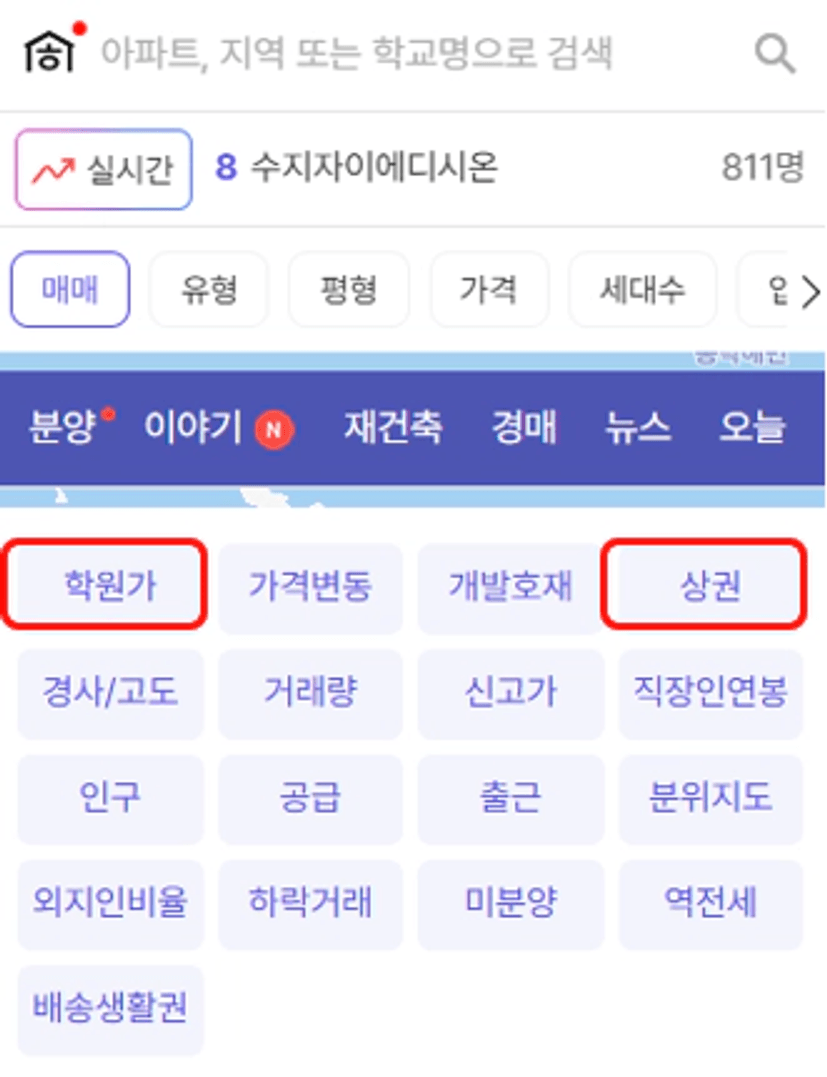 먼저 호갱노노 사이트인데요. 학원가는 모든 지역에 있지 않기에 선택사항이라고 생각해 주시고요. 상권이 있는 곳은 꼭 지나쳐 보셨으면 좋겠습니다. 같이 상권 버튼을 한 번 눌러볼까요?