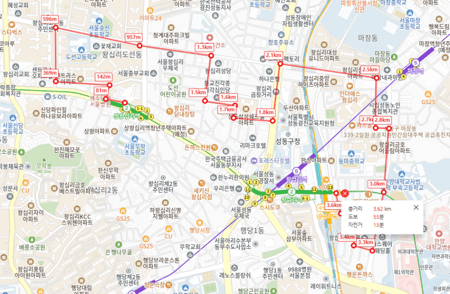 왕십리 상권과 왕십리 뉴타운을 볼 수 있는 1시간 정도 코스로 루트를 짜봤습니다.
