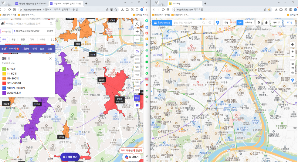 모니터가 하나라면? 호갱노노 윈도우 버튼 + ← / 카카오맵 윈도우 버튼 + → 이렇게 눌러보시면 양쪽 분할해서 화면을 볼 수 있습니다.