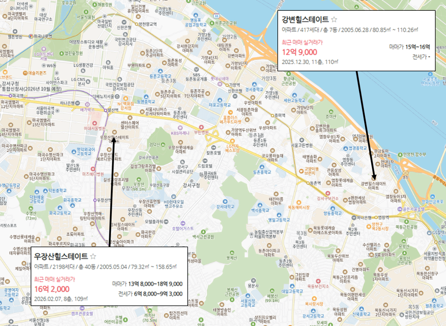 "우장산은 학군과 쾌적함이 좋지만, 그래도 서울은 교통이지! 강남 접근성이 좋은 9호선 급행 염창 강변 힐스테이트가 입지 독점성이 더 있어서 가격이 더 높거나 방어를 잘할 것이다."