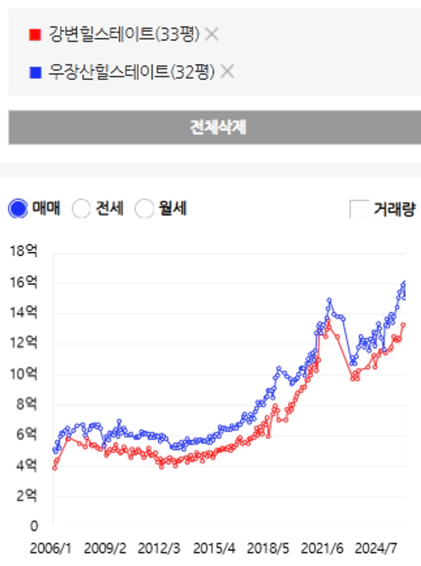 오히려 우장산 힐스테이트가 가격 흐름이 더 견고하거나 높게 형성되는 구간이 보입니다.