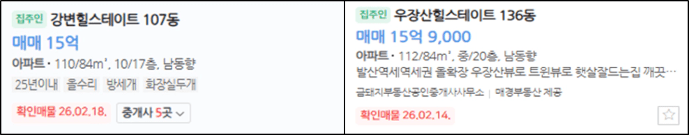 두 단지 모두 연식도 비슷하고, 브랜드도 힐스테이트이며, 가격도 15억 대로 유사합니다. 조건 통일 완료!