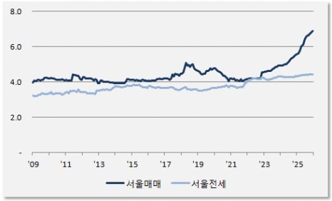 반면, 서울 아파트 하위 20% 매매가 대비 상위 20% 매매가 배율은 2009년부터 2022년까지 4.0~5.0배 사이를 넘나들다가 2023년부터 급등하더니 2025년 12월 기준 6.9배까지 치솟았습니다.