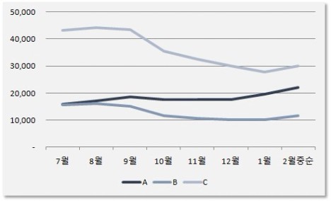 A는 강남3구 및 용산구, B는 성동구ㆍ마포구ㆍ광진구ㆍ양천구ㆍ영등포구ㆍ강동구, C는 나머지 15개구의 아파트 매매 매물 추이를 그려본 것입니다. (참고로 A와 B는 부동산R114 기준 평당가 상위 10개 구를 나열한 것입니다.)