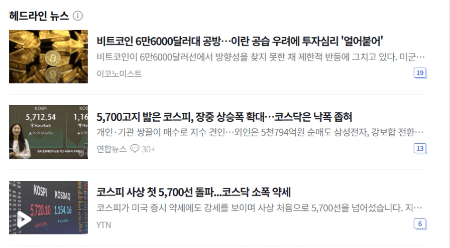 요즘 핫한 코스피 소식과 얼어 붙은 비트코인 소식이 헤드라인으로 보이더라구요