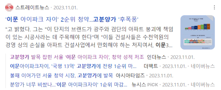 2023년 하반기 분양했던 이문 아이파크 자이는 고분양가 논란으로 청약 미달이 됐던 단지인데요. 물론 당시에는 금리가 지금보다 높기도 했고, 부동산 하락장 분위기 속에서 거래가 활발하지 않았던 시기이기도 합니다.