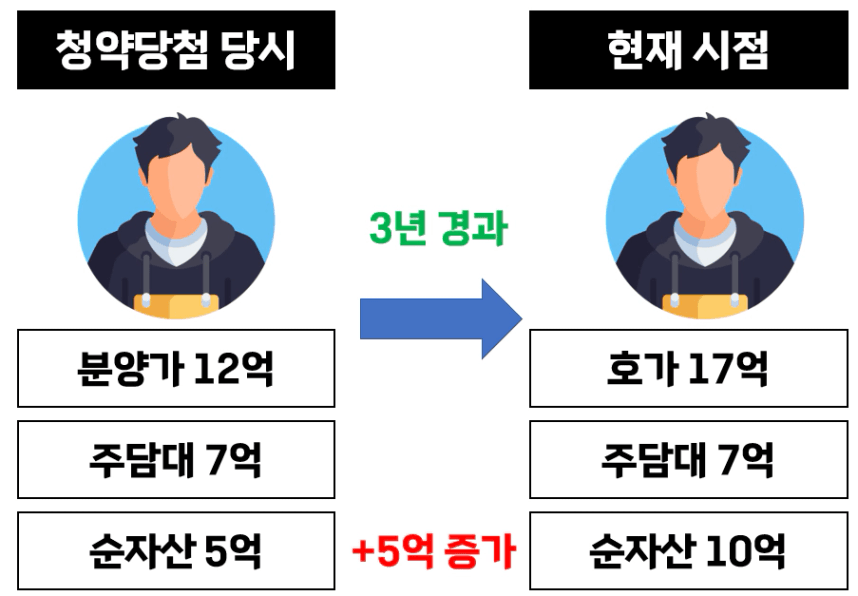앞서 예시로 보여드린 이문 뉴타운 당첨자의 3년 동안 순자산 변화를 먼저 보겠습니다. 현금이 5억원이 있는 상태로 주담대 7억원을 받아서 신축 분양을 받았었는데요. 3년 만에 순자산이 5억원이 늘었습니다.
