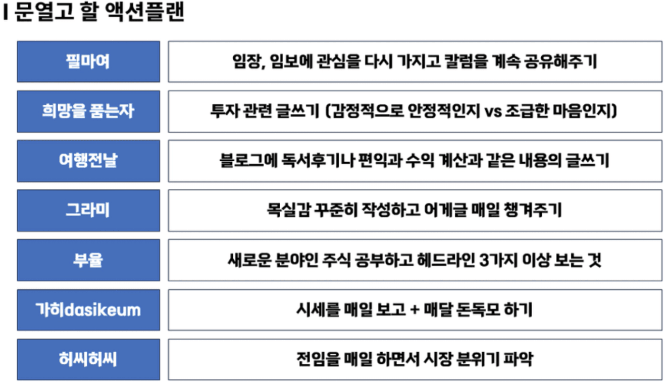 이 중에 쪼끔 더 욕심내서 실행해본다면 “투자일기”를 꼽고 싶습니다.