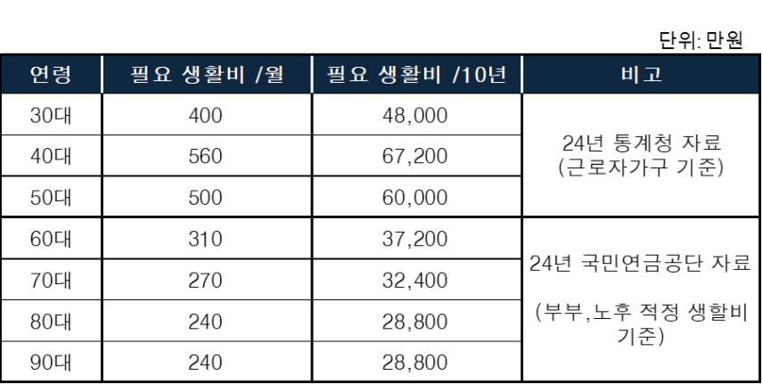 60대 이전에는 근로자가구 기준 필요 생활비로 계산을 하였고, 60대 이후에는 부부 기준으로 노후 적정 생활비 기준으로 필요 생활비를 산정했습니다.