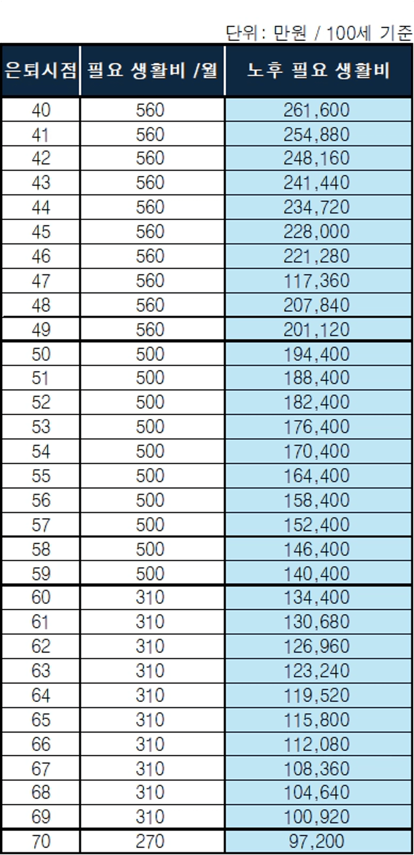 아이들을 한참 교육시켜야 하는 60대 이전에는 대략 400~560만원/월 정도가 필요하고, 60대 이후에는 부부 기준으로 대략 250만~300만/월 정도가 필요함을 알 수 있죠.